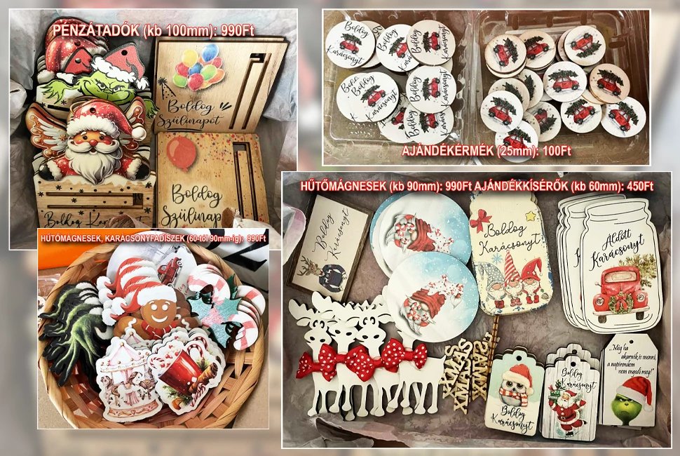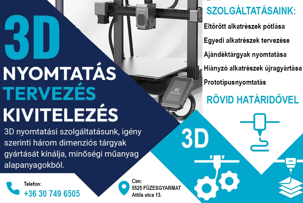 Gravírozás üvegre, fémre, műanyagra, gumira és sok más felületre. Egyedi fotónyomatok bögréken, kulacsokon és dísztárgyakon, logózott vagy feliratozott pólók, pulóverek, szatyrok és párnák – sőt akár teljesen egyedi ruhadarabok is a tervezéstől a kivitelezésig. A 3D nyomtatásnak köszönhetően eltört alkatrészek is pótolhatók, egyedi ajándékok készíthetők, valamint különleges tervek valósíthatók meg. Betűvágással pedig látványos megoldások születnek beltérre, kültérre, járművekre vagy sablonokhoz. A kínálat folyamatosan fejlődik, hogy mindig új ötletekkel és lehetőségekkel szolgáljon.